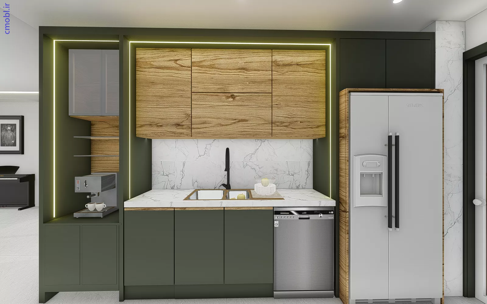 | ترکيب رنگ سبز تيره و چوب و طوسي و چوب با صفحه مشکي طلايي | انتخاب رنگها و MDF | تماس با پيمانکار | |